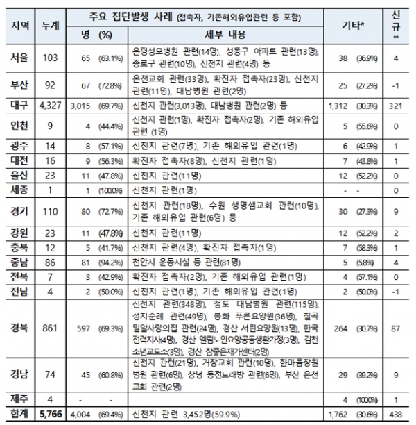 질병관리본부 중앙방역대책본부(본부장 정은경)는 5일 0시 기준으로 438명이 추가 확인돼 총 누적 확진자는 5766명이라고 밝혔다.