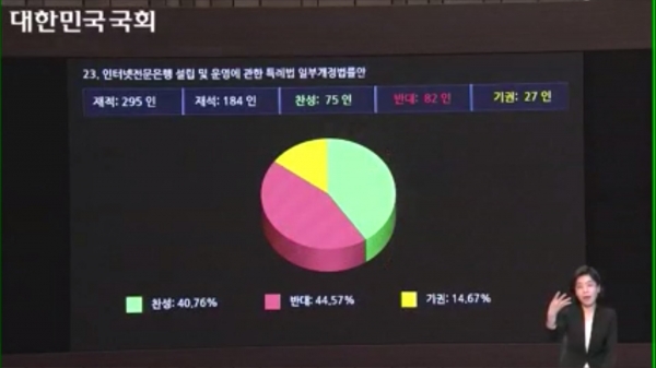 국회는 오늘 오후 2시 본회의를 열어 180건의 법률안 등을 의결하고 있었다. 그런데 어제 법제사법위원회를 무사 통과한 '인터넷전문은행 설립·운영에 관한 특례법 개정안'에 발목이 잡혔다. 이 법은 공정거래법 위반 전력을 인터넷은행의 대주주 적격성 심사 기준에서 제외하는 규제 완화를 골자로 한다.