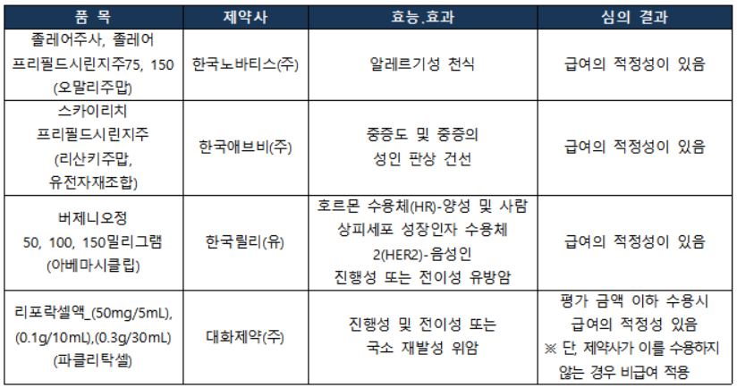 졸레어·버제니오·스카이리치는 '급여 적정', 리포락셀액은 '평가금액 이하 수용 시 급여(조건부 비급여)'로 각각 평가됐다.