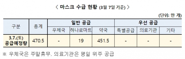주말에는 우체국과 의료기관에 출하되지 않으며, 개정된 '마스크 및 손소독제 긴급수급조정조치' 고시에 따라 6일(어제)부터는 공영홈쇼핑과 중소기업유통센터에 공적 마스크가 공급되지 않는다.