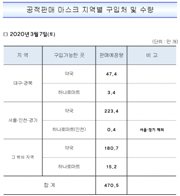 세부적으로 공적판매처 중 약국에 451만5000개, 농협하나로마트에 19만 개가 공급됐다.