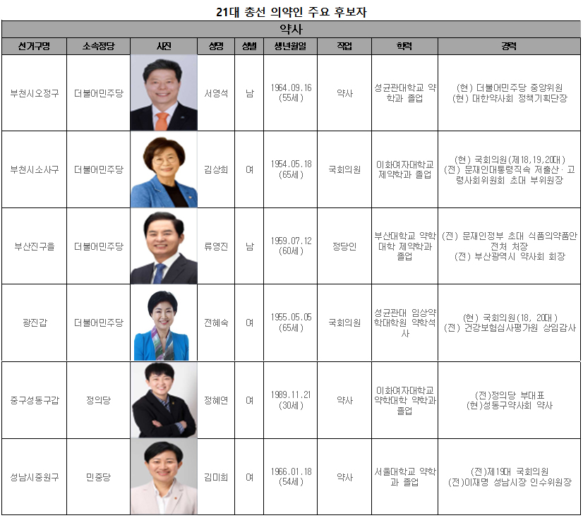 17명의 약사 출신 예비후보자 중 더불어민주당 김상희(부천시 소사구)·전혜숙 의원(광진갑)은 일찌감치 단수 공천을 확정했고, 더불어민주당 부산진구을 경선에서 김승주 前 부산진구 약사회장과 약사 대결을 펼칠 것으로 기대를 모았던 류영진 후보도 지난 6일 단수로 추천됐다.