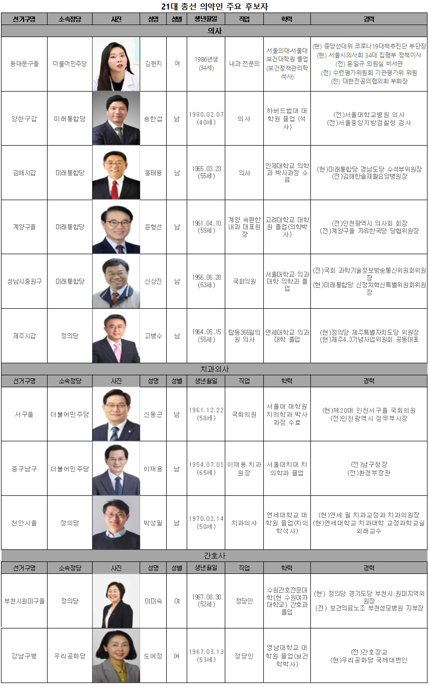 9일 기준 의사·간호사 출신 예비후보자는 41명과 12명인데, 이 중 공천장을 받고 선거운동에 매진하게 된 후보는 총 11명(20.8%)으로 집계됐다.
