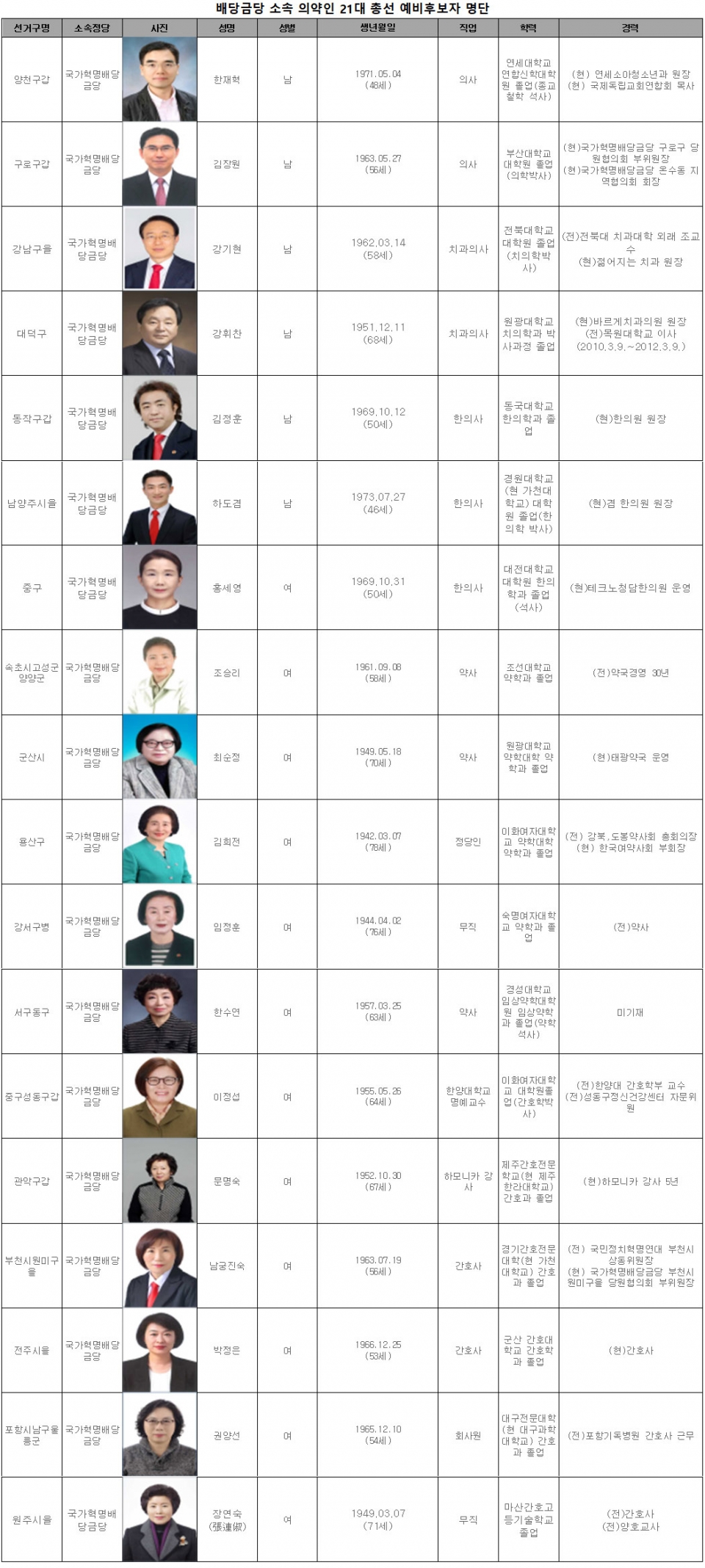 배당금당 소속으로 총선에 도전한 의약인 출신 후보는 18명. 구체적으로 의사 2명, 치과의사 2명, 한의사 3명, 약사 5명, 간호사 6명 등이다.