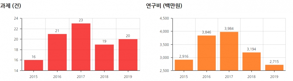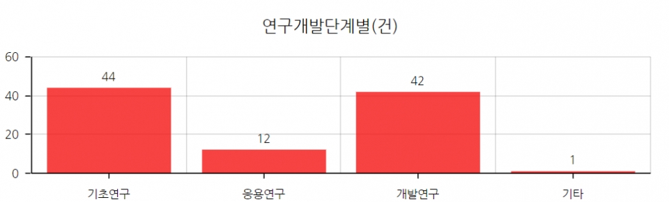과제 건수 역시 비슷한 경향을 보였다. 2015년 16건, 2016년 21건, 2017년 23건으로 증가했다가, 2018년 19건, 2019년 20건으로 소폭 감소하거나 비슷한 경향을 보였다. 구체적인 과제 분야를 보면, 지난 5년간 누적된 과제는 총 99건이고, 연구개발단계별로는 기초연구 44건, 응용연구 12건, 개발연구 42건, 기타 1건이다.