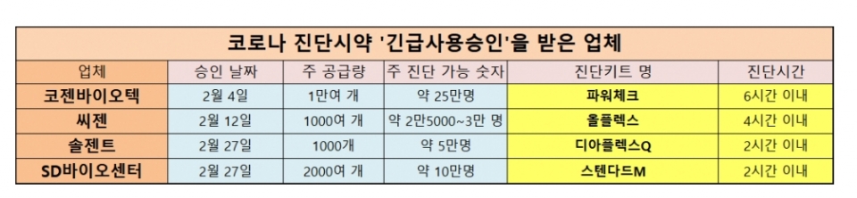 현재, 긴급사용 승인된 코로나19 진단시약 4개 제품은 모두 국내 의료기기 제조업체에서 생산되며, 9일 기준으로 1만 5971 kit(52만 2770명 분량)이 생산됐다.