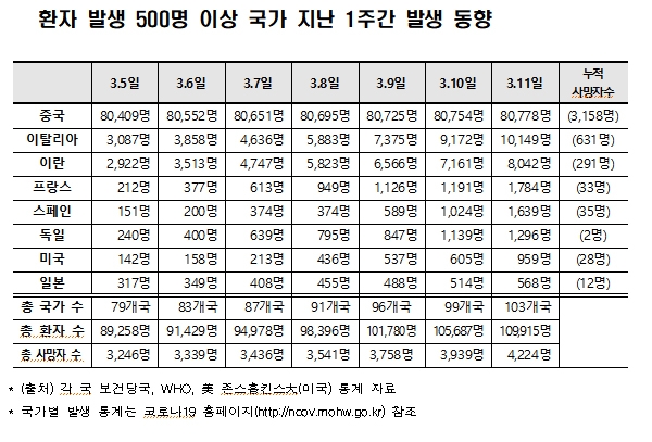국외 상황을 보면 중국의 확진자수가 8만 778명이며, 이탈리아가 1만 149명, 이란이 8042명로 집계됐다.