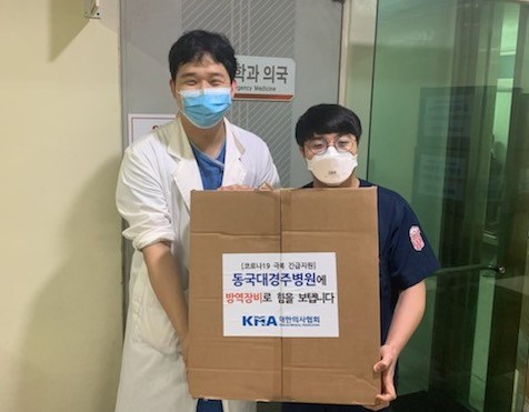 의협은 회원들이 모금해준 소중한 성금으로 동국대 경주병원에 마스크 500매, 방호복 500벌, 경남의사회에 마스크 10000매, 천안의료원에 마스크 10000매, 방호복 1000벌을 각각 지원했다.