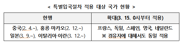 대상 국가는 프랑스, 독일, 스페인, 영국, 네덜란드 5개국이며, 유럽 출발 후 최근 14일 내 경유(두바이, 모스크바 등)해 입국하는 경우에는 입국단계에서 직항 입국자와 구분 후 특별입국절차를 진행한다.
