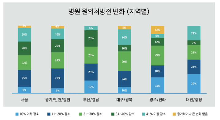 하지만 광주/전라 지역은 코로나19 사태 이전과 비교해 원외 처방 변화에 대해 '소폭 증가 혹은 변화 없음'이라고 답변한 비율(12%)이 전체 평균(4%)보다 높게 나타났다.