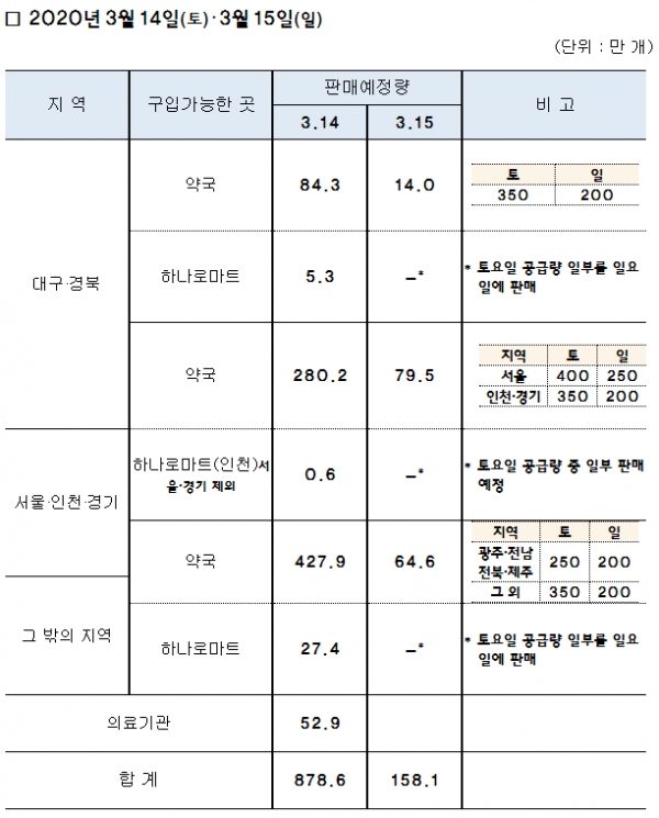 주말 동안 마스크를 구입할 수 있는 곳은 △서울·경기지역은 약국 △그 외 지역은 약국과 하나로마트다. 하나로마트는 오늘부터 '중복구매확인시스템'이 구축되고, 주말 동안에는 주중에 구매하지 못한 분만 구매할 수 있다.