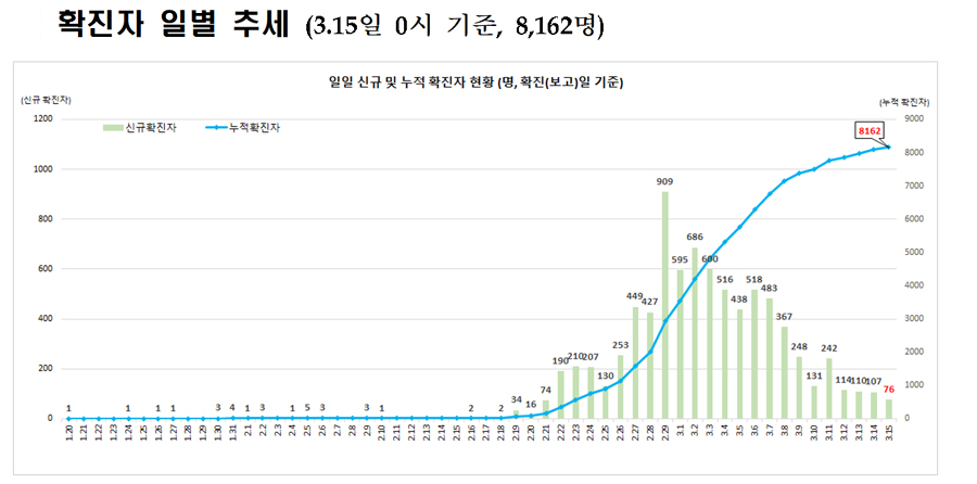 중앙방역대책본부는 15일 0시 기준으로 코로나19 총 누적 확진자수는 8162명이며, 이 중 834명이 격리해제 됐다고 밝혔다. 확진자는 76명이 추가확인 됐고, 격리해제는 120명이 늘었다.