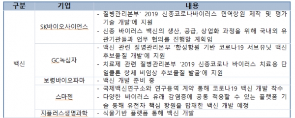 국내 기업 중엔 GC녹십자, SK바이오사이언스 등 기존에 독감백신 등 개발 역량을 갖고 있는 기업들을 중심으로 백신 개발이 이뤄지고 있다. 이들은 자체 백신 생산능력 또한 보유하고 있다는 점에서 백신을 성공적으로 개발할 경우 활발한 국내 공급이 가능할 전망이다.