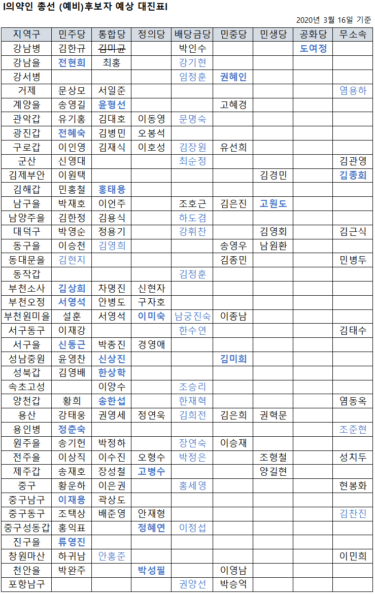 서울 광진갑은 18대·20대 국회 보건복지위원회에서 활약한 전혜숙 더불어민주당 현직 의원과 미래통합당 김병민·정의당 오봉석 후보가 치열한 경쟁을 펼치게 됐다. 민주당 바람이 거센 김제 부안군에서 민생당 예비후보로 출마할 예정이었던 한의사 출신의 김종회 현역 의원은 지난 9일 탈당 후 무소속 출마를 선언했다. 이 지역구에는 민주당 이원택 전 문재인대통령 비서실 청와대 행정관이 단수공천된 상황으로, 쉽지 않은 대결이 예상된다.