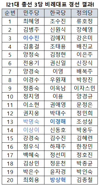 앞서 14일 민주당은 비례대표 후보자 20명과 순위계승 예비자 5명을 확정했다. 민주당은 순번 7번까지를 총선 당선권으로 보고 있어, 순번 3번에 선정된 간호사 출신의 더불어민주당 이수진 최고위원의 당선이 유력한 상황이다. 이수진 최고위원은 5일 민주당 비례대표추천관리위원회 면접 심사와 14일 중앙위원회 순위투표를 거쳐 노동부문 비례대표 후보로 최종 확정됐다.