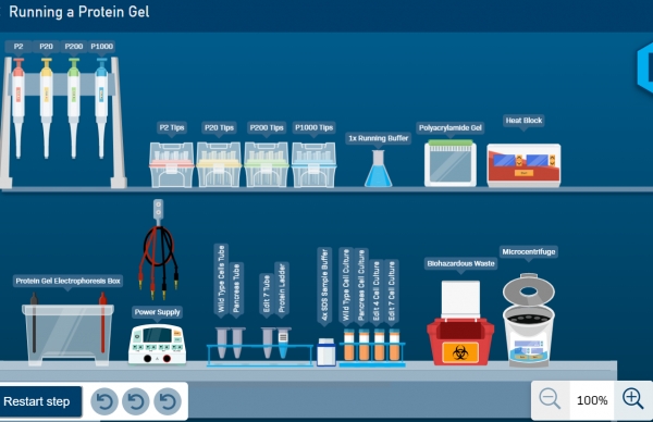 또 유전자 가위 기술이 어떻게 유전자를 자르는지 보여주는 인터랙티브 콘텐츠와 직접 전기영동을 통해 단백질을 분리해 내는 가상실험도 참여할 수 있습니다.