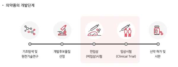 가장 기본적인 의약품의 신약개발 단계는 이렇습니다. ▲기초탐색 및 원천기술연구 과정 ▲개발후보물질 선정 단계 ▲전임상(비임상)시험 단계 ▲임상시험(Clinical Trial)과정 ▲신약 허가 및 시판 순으로 이뤄집니다.