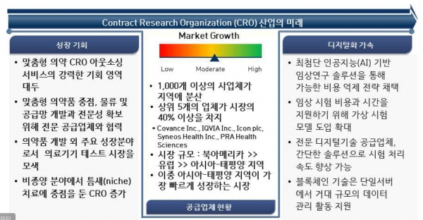 임상시험수탁기관(CRO)이 디지털 기술을 활용해 데이터 분석과 IT 지원 서비스를 강화하는 방향으로 갈 것이라는 전망이 나왔다.