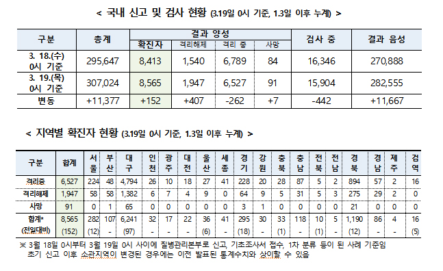 중대본은 19일 기준 코로나19 총 확진자가 8565명으로 집계됐다고 밝혔다. 전일 대비 152명이 늘었고, 사망자도 7명이 추가돼 91명이 됐다.