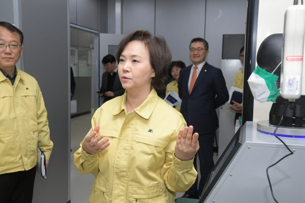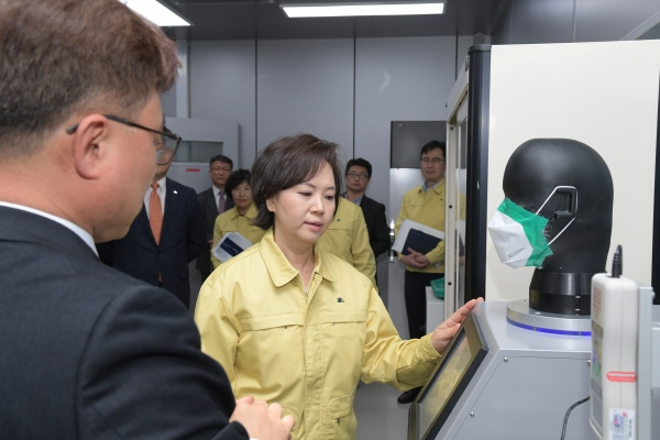 이 처장은 19일 보건용·수술용 마스크 시험·검사를 하는 (재)한국건설생활환경시험연구원 건물에너지기술센터를 찾았다.