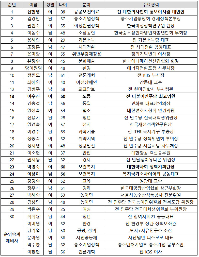 확정후보 명단에는 신현영 前 대한의사협회 홍보이사겸 대변인(1번), 간호사 출신의 이수진 前 더불어민주당 최고위원(13번), 박명숙 대한약사회 정책기획단장(23번), 이상이 보건복지 복지국가소사이어티 공동대표(24번) 등 총 4명의 보건의약인이 포함됐다.