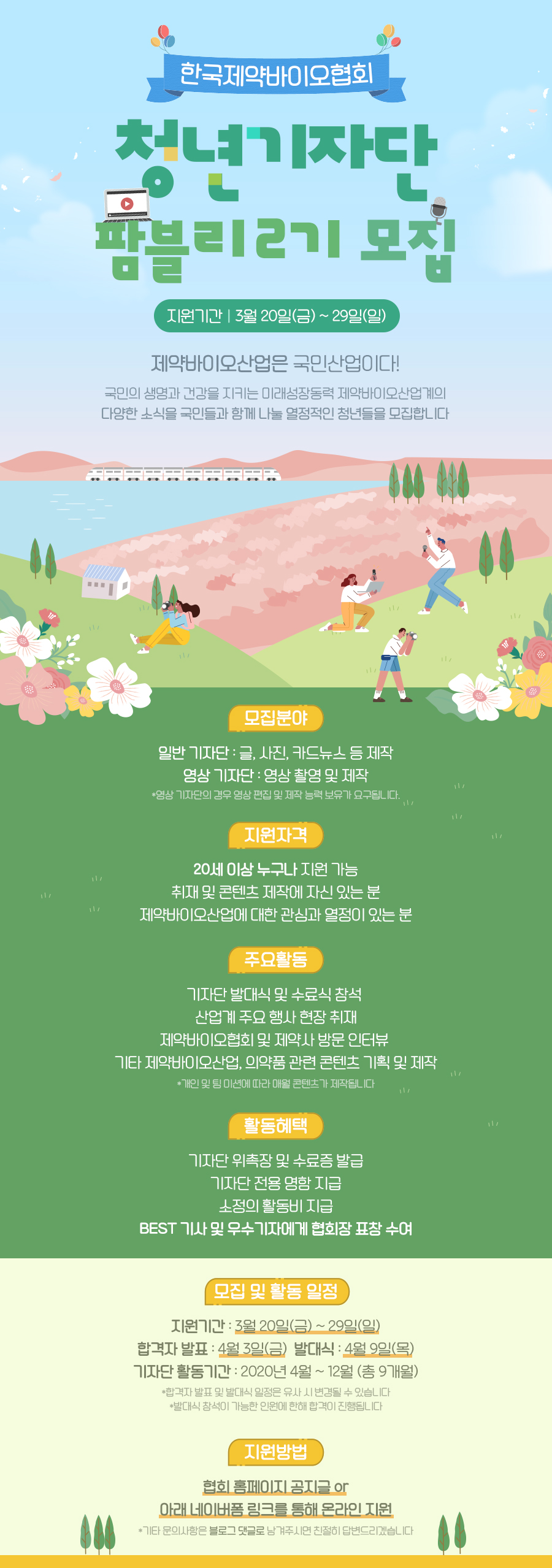 한국제약바이오협회(회장 원희목)는 제약바이오산업에 대한 관심·열정을 가진 한국제약바이오산업 청년기자단 '팜블리 2기'를 오는 3월 29일까지 모집한다고 25일 밝혔다.