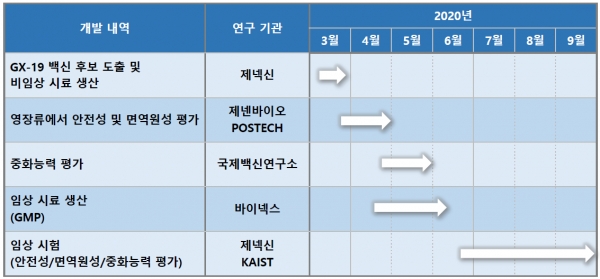 GX-19 DNA백신은 25일 영장류에 투여되고 6월에 지원자를 대상으로 임상을 개시하면 9월에는 중화항체 효능을 알 수 있을 것으로 기대된다고 밝혔다.