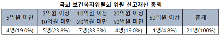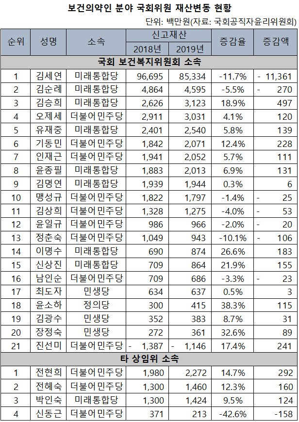 재산 증감율을 보면, 복지위 소속 21명 의원 중 14명의 재산은 늘어났고, 7명은 감소했다. 순수 액수로만 보면, 4억9700만원 증가(18.9%)한 김승희 의원 재산이 가장 많이 늘었다.