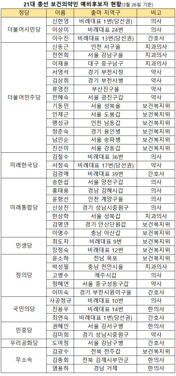 이중 비례대표 후보는 11명으로 압축되는데, 더불어민주당을 주축으로 한 비례연합정당 더불어시민당의 경우 순번 1번에 선정된 전 대한의사협회 홍보이사겸 대변인인 신현영 후보와 순번 13번에 선정된 간호사 출신의 이수진 전 더불어민주당 최고위원의 당선이 유력하다. 박명숙 대한약사회 정책기획단장과 이상이 보건복지 복지국가소사이어티 공동대표도 순번 23번·24번에 나란히 선정됐다.