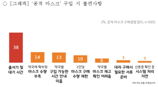 공적마스크 구매자들은 구입 시 가장 불편한 점으로 ▲줄서기 및 대기시간(38%) ▲약국에 확보된 마스크 수량부족(14%) 등을 지적했다.