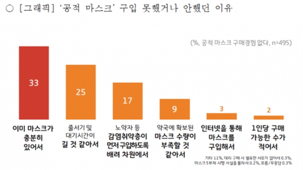 뒤이어 ▲대기시간이 길 것 같은데다(25%) ▲취약층이 먼저 구입하도록 하는 배려 차원(17%)에서 구입하지 않았거나 못했다고 답했다.