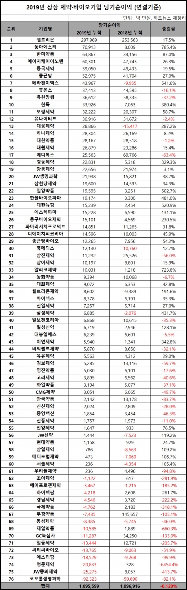 지난해 당기순이익=순이익도 셀트리온이 2979억원(17.5%)으로 가장 높았다. 동아에스티 709억원(785.4%), 한미약품 638억원(87%), 에이치케이이노엔 603억원(26.3%), 동국제약 590억원(19.5%), 종근당 529억원(27%) 순이었다.