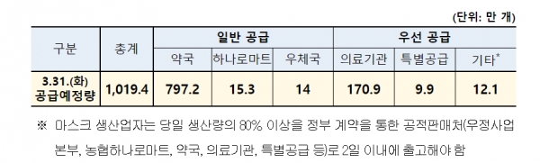 이와 관련 정부는 "마스크가 꼭 필요한 의료·방역 분야 등에 마스크를 우선 배분하고, 나머지 물량에 대해서 모든 국민에게 공평하게 전달될 수 있도록 노력하겠다"고 했다.