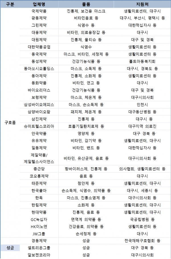 협회 조사 결과 각종 의약품을 비롯해 건강기능식품, 마스크, 손소독제 등 구호품을 지원한 기업체는 모두 32곳으로 집계됐다. 이 밖에 3곳은 성금을, 3곳은 구호품과 성금을 함께 전달한 것으로 파악됐다.