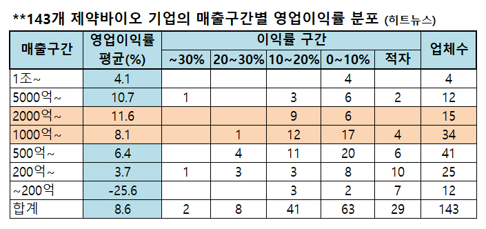 히트뉴스가 2019년도 사업 및 감사보고서를 공시한 143개 제약바이오 기업의 영업이익률을 매출 및 이익률 지표로 분석한 결과 이같이 나타났다. (단독실적 기준)
