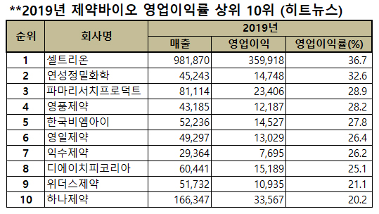한편, 36.7%의 영업이익률을 올린 셀트리온이 전체 1위를 차지했고 연성정밀화학(32.6%), 파마리서치프로덕트(28.9%), 영풍제약(28.2%), 한국비엠아이(27.8%) 순으로 이익률이 높았다.