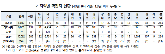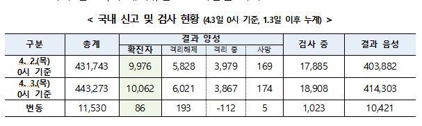 중앙재난안전대책본부는 3일 기준으로 코로나19 총 누적확진자수는 1만62명이라고 밝혔다.