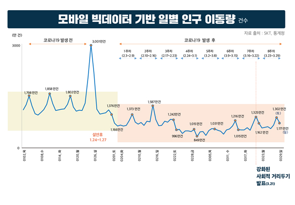 그러나 사회적 거리두기 시행 기간이 길어지면서 많은 국민의 피로감이 누적되고 있는 것으로 보인다. 신천지 교회 감염 사례 발생 이후 개인 이동량이 크게 감소한 후 그 수준이 유지됐으나 최근 다소 증가하는 경향이 나타나고 있다.