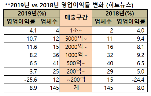 히트뉴스가 145개 국내 제약회사의 2018년, 2019년 영업이익률을 집계한 결과 평균 영업이익률이 8.0%에서 8.9%로 호전됐다.
