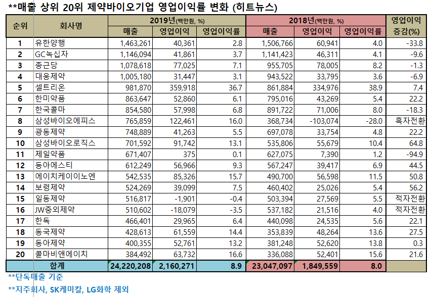 단독매출 기준 상위 20대 기업 중에서는 ▷셀트리온(영업이익 3599억/이익률 36.7%) ▷삼성바이오에피스(1224억/16.0%) ▷삼성바이오로직스(917억/13.1%) 등 바이오기업들의 이익구조가 눈에 띄게 좋았다.