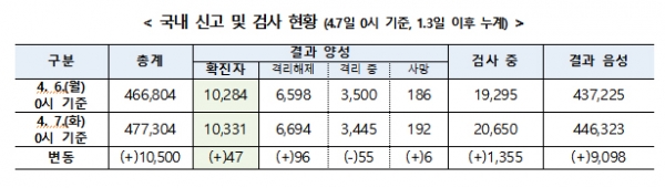 중앙재난안전대책본부는 7일 기준으로 코로나19 치료받는 환자는 3445명이며, 6694명이 완치돼 격리해제됐다고 밝혔다. 코로나19 총 누적 확진자 수는 1만 331명이다.