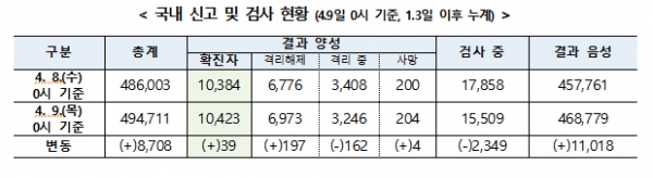 코로나19 확진자는 전날보다 39명 늘었다. 지난 6일과 7일 각각 47명의 환자가 증가했고, 8일 53명, 9일 39명이 늘어 나흘째 50명 안팎을 유지하는 모습이다.