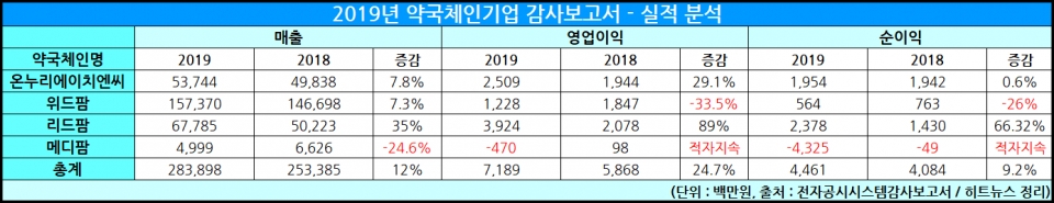 히트뉴스가 9일 오전 금융감독원에 제출된 2019년 기준 온누리·위드팜·리드팜·메디팜 등 4곳 약국체인기업 감사보고서를 분석한 결과 지난해 평균 매출은 총 2838억 원으로 12% 늘었다. 예년 10% 매출 성장을 보인 데 비해 소폭 증가했다.