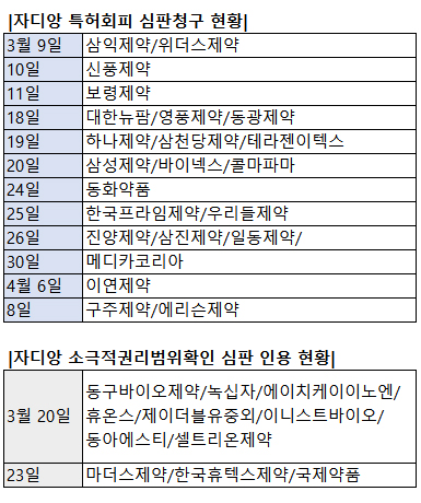 구체적으로 보면, 지난달 9일 삼익제약과 위더스제약, 10일 신풍제약, 11일 보령제약, 18일 대한뉴팜, 영풍제약, 동광제약, 19일 하나제약, 삼천당제약, 테라젠이텍스가 소극적권리범위확인 심판을 청구했다.