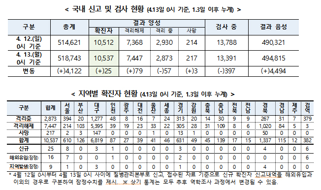 중앙재난안전대책본부는 13일 정례브리핑을 통해 코로나19로 치료 중인 환자는 2873명이며, 7447명이 완치돼 격리해제 됐다고 밝혔다. 사망자는 217명이다.