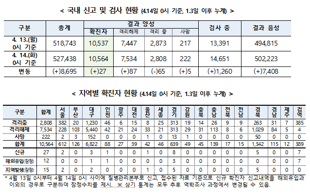 14일 0시 기준으로 코로나19 신규 확진자는 27명으로 나타났다. 격리해제된 인원은 7534명이며 사망자는 5명이 늘어난 222명으로 집계됐다.
