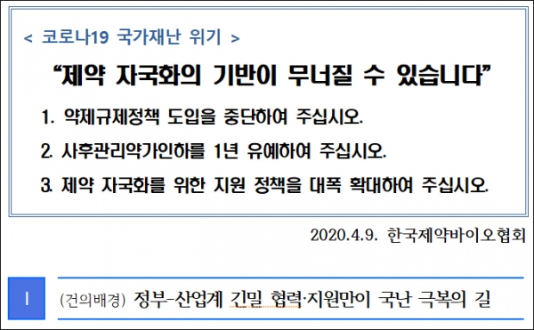 당장 코로나19로 최대 46%까지 급감한 병원 내원환자 영향으로 산업계가 감내해야 할 직접적 매출타격은 약 1조8000억에 이를 것으로 추정했다. 또 중국이나 인도의 원료의약품 생산공장 폐쇄와 임상시험 지연 등으로 인한 원가상승 및 R&D 비용 추가지출 가능성까지 고려하면 삼중고 위기라는 것이 산업계의 현실 인식이다. 기 시행정책은 물론이고 개정정책 역시 예고된 트랙 위에서 운영된다는 점을 모르지 않으나, 글로벌 전체로 확산되는 경제위기 상황이 오늘 내일 간단히 해결될 것 같지 않다는 점에서 정책결정의 특단이 요구된다.