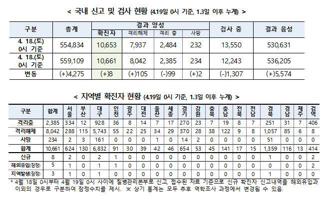 질벼오간리본부 중앙방역대책본부는 19일 코로나19 총 누적 확진자수는 1만 661명이며, 이 중 8042명이 격리해제 됐다고 밝혔다.