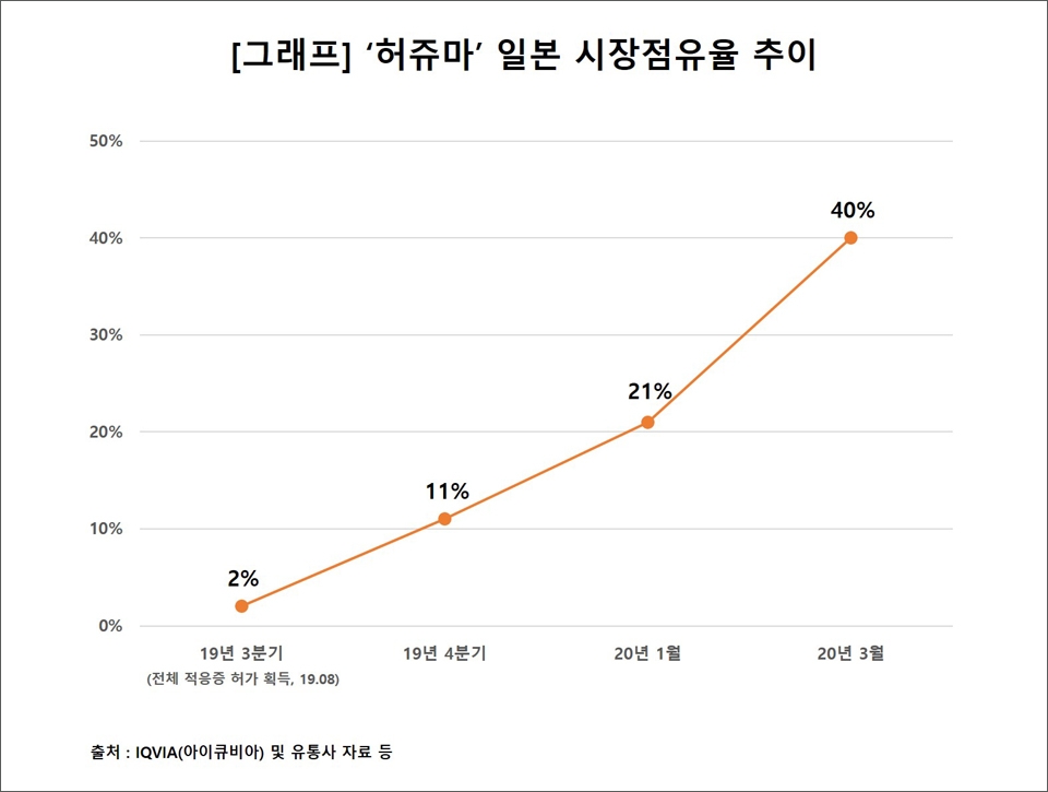 현재 일본에서는 허쥬마를 포함해 3개의 트라스투주맙 바이오시밀러가 진출한 상황인데, 허쥬마는 일본 트라스투주맙 바이오시밀러 시장에서 95%의 점유율을 기록하며 경쟁 제품들을 압도한 가운데 사실상 독주 체제를 확고히 했다.