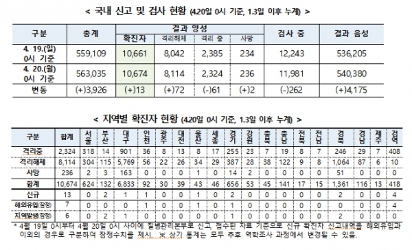 중앙재난안전대책본부는 20일 코로나19 신규 확진자가 13명으로 확인됐다고 밝혔다.